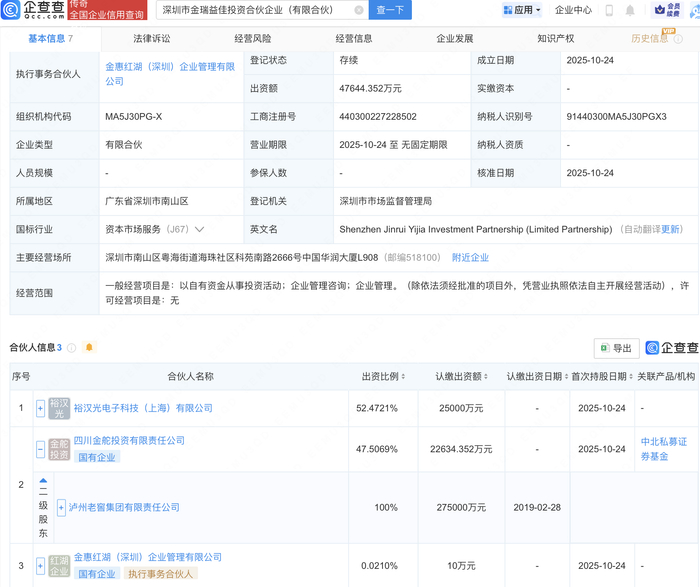 Core Insights - Shenzhen Jinrui Yijia Investment Partnership (Limited Partnership) has been established with a capital contribution of approximately 476 million yuan, focusing on investment activities and enterprise management consulting [1][2]. Company Information - The partnership is registered in Nanshan District, Shenzhen, with a business scope that includes investment activities using its own funds and enterprise management consulting [1][2]. - The partnership is set to operate indefinitely, with its registration date being October 24, 2025 [2]. Ownership Structure - The main contributors to the partnership include Luzhou Laojiao Group's subsidiary Sichuan Jinjue Investment Co., Ltd., which is a significant stakeholder [1][3]. - The ownership distribution shows that Gehan Guang Electronics Technology (Shanghai) Co., Ltd. holds 52.47% with a contribution of 250 million yuan, while Sichuan Jinchuan Investment Co., Ltd. holds 47.51% with a contribution of approximately 226.34 million yuan [3].
