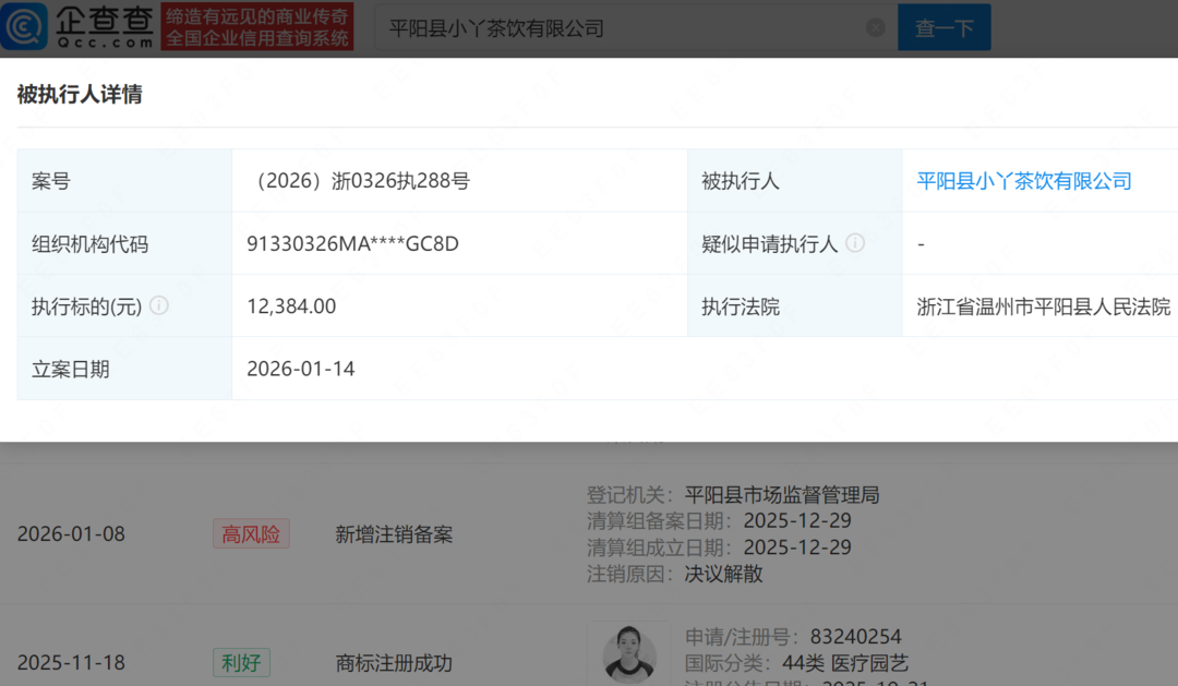 企查查APP显示,近日,平阳县小丫茶饮有限公司新增一则被执行人信息,执行标的约1.24万元,执行法院为浙江省温州市平阳县人民法院。该公司成立 于2024年10月,注册资本30万元,经营范围包含互联网销售、食用农产品批发等,由肖娅(网红柴怼怼妻子)担任法定代表人、经理、董事并持股80%。 去年12月,该公司已向平阳县市场监督管理局登记机关申请注销登记,注销备案公告期为2025年12月29日-2026年02月11日。 (企查查) ...