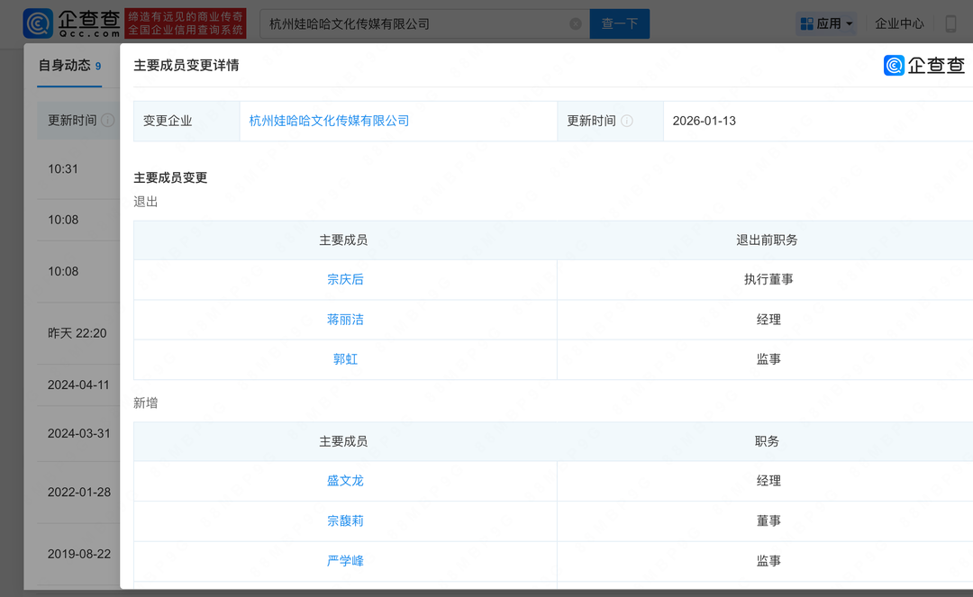 | | | | 序号 | | 股东名称 | | 持股比例 ÷ | 认缴出资额(万元) ۾ | 认缴出资日期÷ | 实缴出资额(万元) ① ÷ | 实缴出资日期÷ | | --- | --- | --- | --- | --- | --- | --- | --- | --- | | | 杭州宏振投资有限公司 ( | 大股东 企业名已更新 | 90.00% | | 450 | 2020-12-31 | 450 | 2015-09-07 | | | 杭州萧山振华广告有限公司 | | 10.00% | | 50 | 2020-12-31 | 50 | 2015-09-05 | (企查查) 企查查APP显示,近日,杭州娃哈哈文化传媒有限公司发生工商变更,宗庆后卸任法定代表人、执行董事,盛文龙接任法定代表人并担任经理,宗馥莉担 任董事,严学峰担任监事,同时,部分主要人员发生变更。企查查信息显示,该公司成立于2015年8月,注册资本500万人民币,由杭州宏振投资有限公 司、杭州萧山振华广告有限公司共同持股。值得一提的是,此前,宗馥莉已接任宏胜饮料集团有限公司法定代表人、经理。 | | 箱造有远见的商业传奇 国企业信用查询系 ...