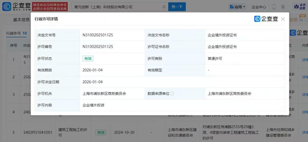 企查查APP显示,近日,智元机器人关联公司智元创新(上海)科技股份有限公司新增企业境外投资许可,许可机关为上海市浦东新区商务委员会,许可 有效期自2026年1月4日起。 (企查查) | 15615 | | 缔造有远见的商业 全国企业信用查询 | | 智元创新 (上海)科技股份有限公司 | | 8 | 查一下 | 一 应用 ▼ 企业中心 | | | | --- | --- | --- | --- | --- | --- | --- | --- | --- | --- | --- | | 基本信息 | | 行政许可详情 | | | | | | | © 企查查 | 信息 79 | | 行政许可 10 | | 决定文书号 | | N3100202501125 | | 决定文书名称 | | 企业境外投资证书 | | ○作查 | | 序号 | 咲定 | 许可编号 | | N3100202501125 | | 许可证书名称 | | 企业境外投资证书 | | 公 内容 | | N3 | 5 | 许可状态 | 有效 | | | 许可类别 | | 普通许可 | | 图 详情 | | | | 有效期目 | | 2026-01-04 ...