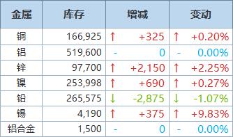| 金属 | 库 | 増减 | 变动 | | --- | --- | --- | --- | | 同 | 166,925 1 | +325 1 | +0.20% | | 铝 | 519,600 | 0 | 0.00% | | 蚌 | 97,700 ↑ +2,150 | 1 | +2.25% | | 臭 | 253,998 1 | +690 1 | +0.27% | | 铝 | 265,575 J | -2,875 T | -1.07% | | 锡 | 4.190 ↑ | +375 ↑ | +9.83% | | 铝合金 | 1.500 | 0 | 0.00% | | LME库存 | | --- | | 金属 | 库存 | 注册仓单 变动 | 注销仓单 | 变动 | 注销占比 | FBRK | | --- | --- | --- | --- | --- | --- | --- | | 테크 | 166,925 | 102,475 ↑ +0.27% | | 64,450 ↑ +0.08% | 38.61% | 38.66% | | 铝 | 519,600 | 445,925 1 -1.47% | | 73,675 ...