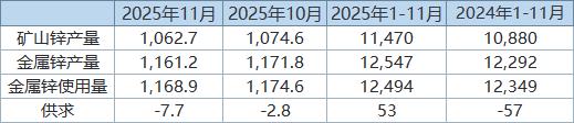 1月21日(周三),国际铅锌研究小组(ILZSG)公布的数据显示,2025年11月全球锌市场供应短缺增 至7,700吨,10月为短缺2,800吨。 | | | | 2025年11月 2025年10月 2025年1-11月 2024年1-11月 | | | --- | --- | --- | --- | --- | | 矿山锌产量 | 1,062.7 | 1,074.6 | 11,470 | 10,880 | | 金属锌产量 | 1,161.2 | 1,171.8 | 12,547 | 12,292 | | 金属锌使用量 | 1,168.9 | 1,174.6 | 12,494 | 12,349 | | 供求 | -7.7 | -2.8 | 23 | -57 | 以下为详细数据(单位:千吨) ILZSG数据显示,2025年1-11月全球精炼锌市场供应过剩53,000吨,2024年同期供应短缺57,000吨。 ...