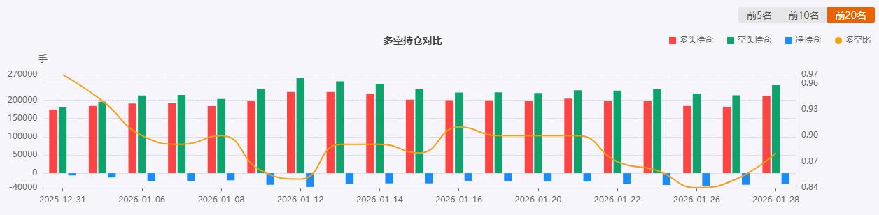 今日市场情绪亢奋,大量资金涌入沪铝,推动期价大涨,创历史新高,主力合约收涨5.75%,持仓增加逾5万手,资金流入超17亿元。 从交易所公布的持仓龙虎榜来看,沪铝多空持仓排名前20席位均呈入场态势,多头前20席位持仓量增加32432手至21.21万手,空头前二十席位持仓增加 31112手至24.15万手,多空比为0.88。今日早盘多头快速进场,多头能量集中释放,期价快速拉升。 从今日主力合约具体持仓来看,多头方面,永安期货席位表现最为抢眼,单日增持多单8148手,空头减持113手,居于多头第三位,为多头增仓的核心力 量。东证期货席位紧随其后,增持多单5467手,空单增持1821手。此外,中财期货席位及宏源期货席位今日净多头持仓规模明显扩大,分别增加4295手和 3467手,展现出看多预期。多头榜首国泰君安期货席位多头持仓增加5069手,在空单增持略多,达5998手,净空头持仓规模增加929手。空头榜首中信期货 席位同样也在多空两侧同时增仓,但其空头增仓更为明显,增持5884手,而多单仅增加752手,立场更偏空,为今日净空头持仓规模增加最大的席位。广发 期货席位进行多空双增操作,空头增持数量大于多头增持,由多翻空 ...