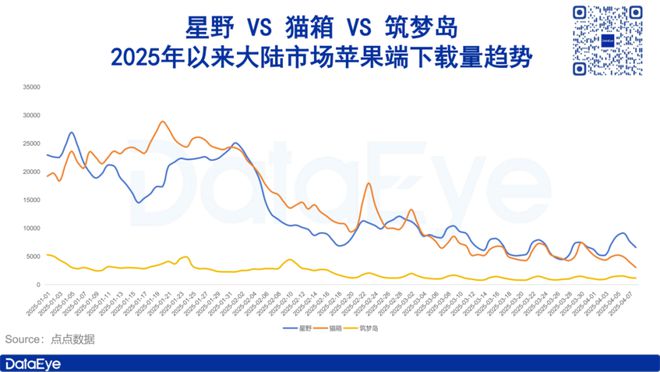 文 | DataEye 自人工智能技术爆发以来,AI陪伴类产品便是热点之一。有机构预测,2025年至2028年,中国市场AI 情感陪伴行业市场规模将由38.66亿元增长至595.06亿元,期间年复合增长率148.74%。 然而,DataEye研究院发现,AI陪伴类产品中,去年曾盛极一时的社交AI APP业态,悄然发生巨变。 星野、猫箱等产品近期投放力度均大幅下滑,活跃用户量也面临大幅萎缩,整个行业似乎迎来集体降 温。 社交AI,到底是怎么了? 本期,DataEye研究院以星野、猫箱、筑梦岛三款头部社交AI产品为例,通过数据、市场角度,对社交 AI行业转变进行探讨,希望能给大家带来一定参考。 第一节:星野VS猫箱VS筑梦岛数据对比 (一)下载量趋势对比 点点数据显示,2025年以来,星野、猫箱与筑梦岛三款社交AI应用大陆市场苹果端下载量下滑明显。 其中,星野与猫箱作为国内社交AI领域两款头部产品,下载量走势极为接近,2月上旬之前下载量均处 在高位,日下载量约2万次左右,2月上旬开始下载量迅速下滑,至如今日下载量维持在7000次左右。 筑梦岛整体下载量偏低,但下滑趋势同样明显。2月中旬之前,筑梦岛日下载量普遍在3 ...