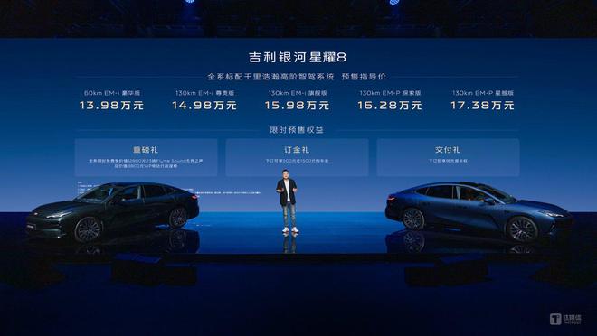 吉利银河星耀8 当新能源渗透率一路逼近四成、插混成为"既要远行又要省油"的最佳平替,中国品牌终于把枪口抬向了 曾经被合资和豪华把持的 D 级轿车阵地。 4月10日,吉利银河星耀8 以 13.98万‑17.38万元的预售价杀到现场,这台5米级中大型插混,直接把"50 万级体验"贴进了20万的预算上限。 对吉利来说,这不仅是一次越级挑战,更是一次对中大型轿车格局的重新定义尝试。在电混崛起、合资 节节败退的2025年,这类车型正成为市场最具想象力的"狙击炮"。 星耀8的纸面战力有哪些? 按吉利的说法,星耀8拥有"五大豪华"——从设计、动力、座舱、安全到科技,你可以理解为"造车人类 高质量堆料现场",也可以理解为一次吉利向比亚迪汉的精准狙击。 首先是设计。星耀8车长度超过5米、轴距接近3米,霁海蓝、国墨灰这些配色不仅诗意,还妥妥踩在 了"中式豪华"的文化审美点上。无框车窗、隐藏式门把手、贯穿式尾灯该有都有,甚至连D柱的"断桥 灵感"都能写出一篇设计美学论文。视觉上,它确实是20万以内最有"豪车范儿"的那一批。 吉利银河星耀8 星耀8,选择的是"配置极致+美学差异化"的路径,在体验端持续放大"中式豪华"的文化锚点,力图 ...