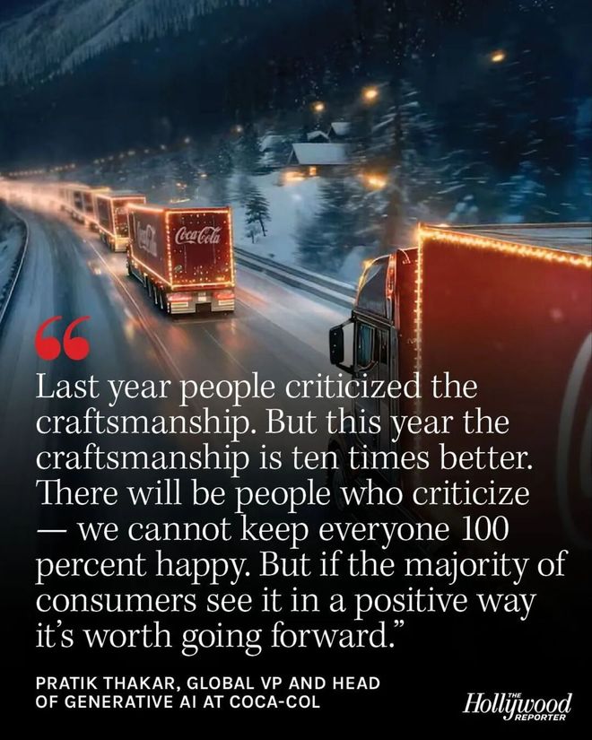 文 | 增长黑盒GrowthBox 今年圣诞营销季,可口可乐又把自己送上了舆论的风口浪尖。 没错,还是因为AI。 继去年那支被吐槽"人脸僵硬恐怖"的AI圣诞广告后,今年,可口可乐再度出手,用AI重塑了1995年的经 典广告《节日将至》。这一次,他们学"聪明"了——主角全员换成了毛茸茸的北极熊、熊猫和树懒,避 免了技术不足带来的"恐怖谷效应"。 视频来源:Coca-Cola | Holidays Are Coming 制作工艺提升了,但骂声却更猛烈了。 然而,面对如潮的差评,可口可乐的回应是:是的,这是不完美的,但我们要继续。 今天,我们就来扒开可口可乐的AI外壳,看清其背后的战略意图。 AI广告或许"毫无灵魂",但AI战略不可动摇 让我们先回到争议本身。今年的AI圣诞广告,到底是怎么做出来的? 根据公开报道,这支广告由一个五人的小型专家团队,利用AI生成了70,000条视频片段,并从中进行筛 选和集合,最终成片制作周期仅为30天(过去可能需要提前一年时间进行准备)。 对比2024年的版本,新版本无疑更精致流畅。 "我们运用先进的生成式 AI 工具,从镜头角度到物理驱动的真实感,通过直观的可视化标注模拟导演工 ...