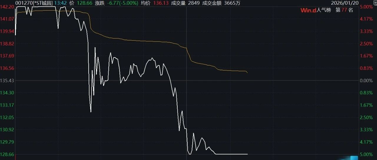 1月16日晚间,深交所表示,近期"*ST铖昌"股价出现严重异常波动,公司停牌核查并发布风险提示公告,1月16日复牌后股价继续涨停,部分投资者在 交易该股过程中,存在影响股票交易正常秩序的异常交易行为,本所依规对相关投资者采取了暂停交易等自律监管措施。 而1月16日,*ST铖昌复牌走出"地天板"行情后,1月19日,该股再度涨停。 1月20日,*ST铖昌高开后快速拉升涨停,盘中股价震荡下挫,午后开盘,*ST铖昌继续走低,触及跌停,上演"天地板"。截至发稿,*ST铖昌封跌停, 报128.66元,成交额超16亿元。 *ST铖昌股价自2025年12月1日以来大幅拉升,被市场称为近期商业航天板块大牛股。资料显示,公司的主营业务是微波毫米波相控阵T/R芯片的研 发、生产、销售和技术服务。 相关阅读: 商业航天牛股复牌上演"地天板" 编辑丨瑜见 ...