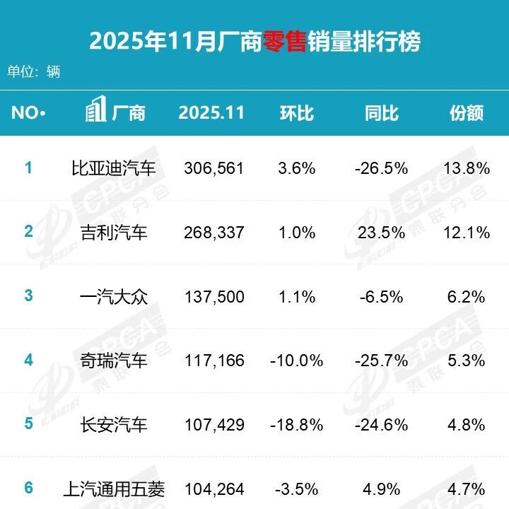 以下文章来源于时代财经APP ,作者贺晴 时代财经APP . 聚焦于企业财经新闻,互联网新闻信息服务许可证编号:44120230006 来源|时代财经 作者 | 贺晴 编辑 | 张泽 作为汽车市场年底冲刺销量的关键期,今年11月的国内乘用车销量同比下滑。 12月11日,中国汽车工业协会(下称"中汽协")发布最新一期的汽车工业产销情况,今年11月,乘用车国内销量241.4万辆,环比增长1%,同比下 降6.5%。作为参考,去年同期,乘用车国内销量环比增长12.8%、同比增长17.5%;2023年11月该数据亦录得同、环比双增。 此外,根据此前乘联会披露的数据,今年11月,国内狭义乘用车市场零售销量达222.5万辆,同比下降8.1%,环比下降1.1%。 乘联会秘书长崔东树指出:"今年国内车市零售累计增速从1-2月增长1.2%,3-6月增长15%,7-9月增速徘徊在6%左右,10-11月回落到偏低状 态,呈现4季度高基数的减速特征,基本符合年初判断的'前低中高后平'的走势。" 他强调,今年调节车市增速的重要政策是"以旧换新"补贴。由于今年的前期增长较快,政策补贴本身目标是稳定总体增长幅度,因此年末稳增速的现 象是合理 ...