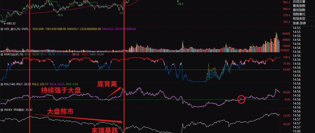 大多数时候我们都把注意力放在今天如何了,明天将会如何,很少去审视全局的空间和时间轴,这样就容易陷入日间轮动,被自媒体的 传销节奏带着走。 长周期动量指标虽然不能立即给出择时信号,但对于理解机构行为非常有益。前面已经有篇文章讲了易中天的RSL顶背离(见顶分 歧),昨天的文章重点是讲一阶段的RSL和SSV共振出水,切入二阶段主升。 今天再回溯到大熊市末期的RSL底背离(主动建仓),关于熊市末端的动量知识点以前也分享过,主要是讲主图上的RSLine和平均股价 指数之间的大级别底背离,预示机构正在逆势建仓。 RSL副图指标是在主图的RSLine基线基础上计算均值乖离,是一个明确意义的动量值。 去年5月份,有色行情还没有发动之前,我明确预期过它将是后续主线之一,其中最关键的判据就是2024年2月份的前置RSL底背离,彼 时乌青同志刚刚走马上任,以及那一波上的巨大涨幅(前置动量),看图: 钨钼细分类别中的洛阳钼业、中钨高新、厦门钨业、章源钨业,彼时都和板块指数有同样的底部动量结构,而且第一波涨幅甚大,就是 说新领导走马上任给出了明确信号,机构建仓加速了。 欧奈尔和马克所讲的大结构第一波,就是这个第一波,涨幅超过50%为佳 ...