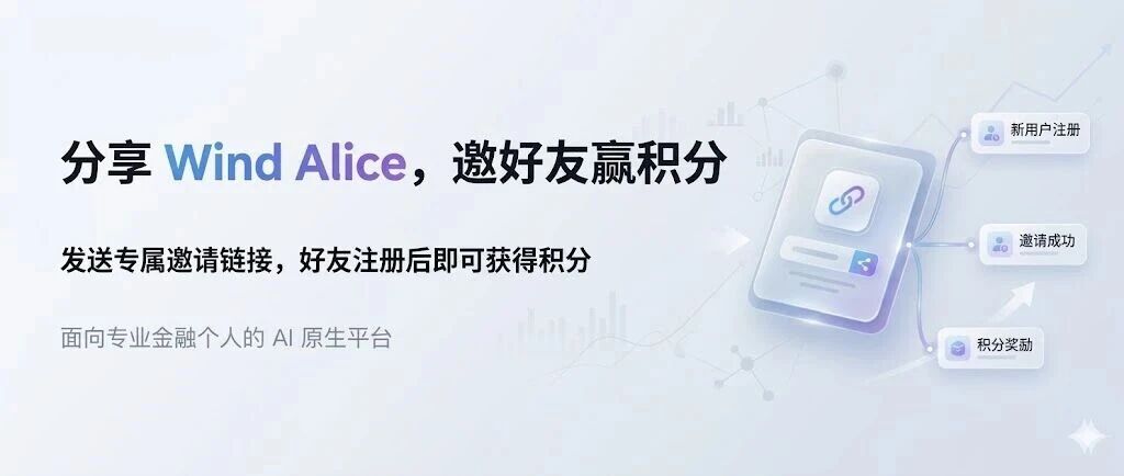 万得 AI - Wind Alice 近期刚刚推出,就受到了市场极度踊跃的好评与关注!很多新用户的第一反应是:太好用了!但是积分不够用 怎么办?! 大家都在问: 不要慌!看过来! Wind Alice 现在就有一套非常惊喜的 " 送积分 " 机制。 不是复杂玩法, 注册就送、每天登录就送、邀请朋友再送。 一边用,一边囤积分。 ✅ 先看懂:现在有哪些积分可以拿? 目前在新用户体验活动期, Wind Alice 的积分主要来自 3 种方式: · 新用户注册:直接送 1000 积分 · 每天登录:再送 600 当日积分 · 每天邀请 1 位新用户注册,且新注册用户完成任何一次"金融问答"、"深度研究"或"技能":你再得 500 积分 也就是说: · 你自己注册,先有一笔。 · 你每天登录,还会继续补。 · 你把 Wind Alice 分享给朋友,朋友注册成功并完成任务,你还能继续拿奖励。 在 T oken 就是"金钱"的时代,这不是 " 看着热闹 " 的活动机制,是真的可以一笔一笔累起来的使用额度。 注册先送 1000 分,先把 Alice 用起来 如果你是第一次注册 Wind Alice ,系统会直接送你 100 ...