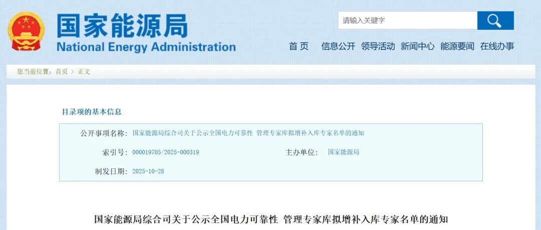 文 | 国家能源局 11月1日,国家能源局就全国电力可靠性 管理专家库拟增补入库专家名单进行公示,其中 包括供电可靠性管理专业(191人)、低压供电可靠性管理专业(2 3人)、电力系统可靠 性管理专业(4 9人)、信息系统开发及运维专业(19人),共计2 8 2人。公示时间从2 0 2 5 年1 0月30日至11月5日。 以下为原文 国家能源局综合司关于公示全国电力可靠性 管理专家库拟增补入库专家名单的通知 各有关单位: 根据相关要求,现将国家能源局全国电力可靠性管理专家库2 8 2名拟增补入库专家情况进 行公示。公示期间,如对拟入库专家有异议,请向国家能源局电力可靠性管理和工程质量 监督中心反映。 公示时间:2 0 2 5年1 0月3 0日至11月5日 联系人:黄东辉 电话:010 - 8 8 0 7 2 9 2 1 附件 全国电力可靠性管理专家库 拟增补人库专家名单 (排名不分先后) 一、供电可靠性管理专业(191人) | 序号 | 姓名 | 工作单位 | 专业 | | --- | --- | --- | --- | | 1 | 宁 听 | 国网公司设备管理部 | 供电专业 | | 2 | 王庆杰 | 国 ...