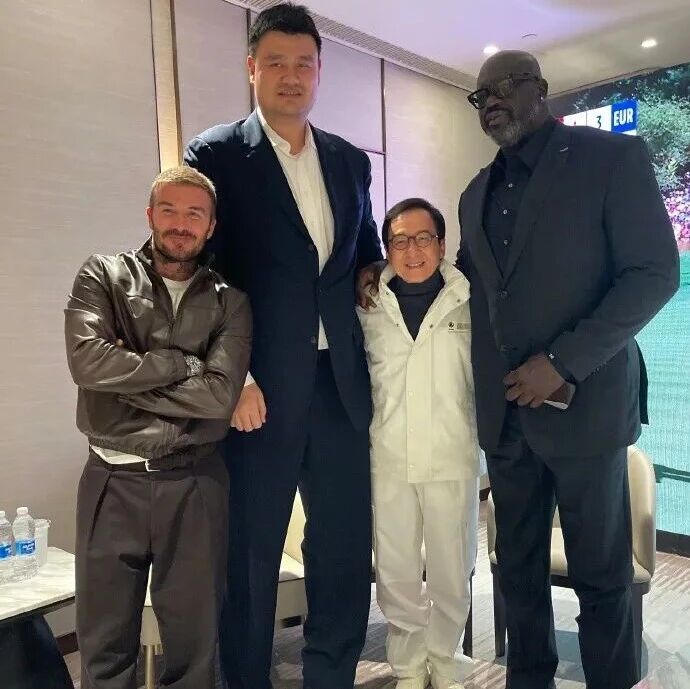 Group 1 - The article highlights the social media activity of the internationally renowned actor Jackie Chan, who recently shared photos with celebrities David Beckham, Yao Ming, and Shaquille O'Neal, expressing joy at their reunion [1][2] - In one of the photos, the arrangement of the four individuals led to humorous comments from netizens, referring to their heights as a "凹凸凹凸组合" (concave-convex combination) [2] - Another photo shows Jackie Chan sandwiched between Yao Ming and Shaquille O'Neal, emphasizing the significant height difference, which prompted amusing reactions from online users, such as "Dragon Uncle looks like a small figurine" [4]