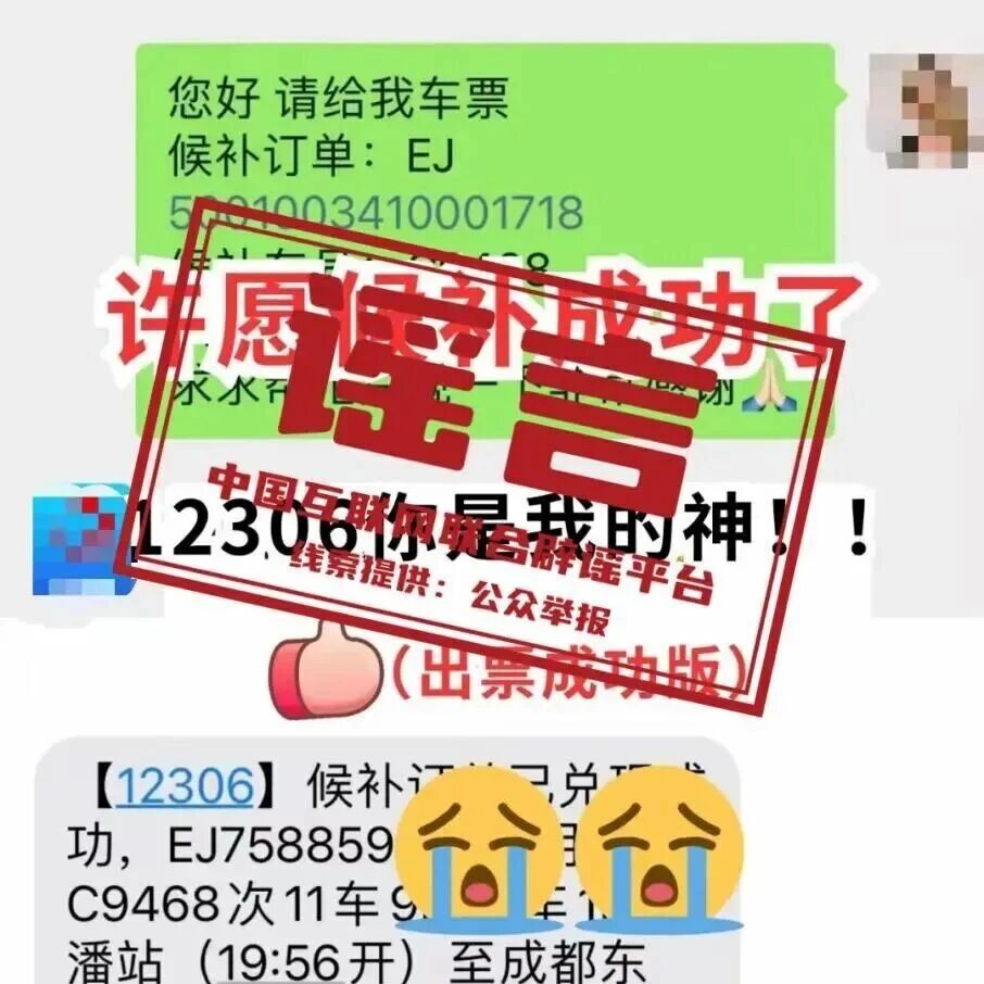 随后,记者联系12306官方客服,工作人员表示,并没有"留言就能提高候补成功率"的说法,是否能候补成 功都是按照用户提交顺序来排的,至于有 用户留言后候补成功是巧合情况, 官方没有特殊的抢票渠道,也不 建议使用第三方平台所谓"抢票加速包"。 源:铁路12306 春节将至,不少人即将或已经踏上春运旅程。但也有部分人仍在候补车票当中,由此,一种 "许愿抢票法" 在 社交平台走红,许多网友还分享 "成功候补" 的经验。 据了解,所谓"许愿抢票法"实际上就是 用户通过微信或短信多次私信12306官方,留言"许愿"抢票成功,结 果真的候补到了车票,颇为"玄学"。 2月9日上午,记者在某社交平台上搜索关键词发现,大批网友发布相关帖文,称自己用这种方法真的候补到 了车票,成功概率貌似真的变大了。不过,也有网友留言表示自己留言多次,仍没有候补成功。 记者注意到,2月6日,铁路12306官方微信发布年度十大谣言中,专门对"许愿抢票法"辟谣:留言补票成功 纯属巧合,铁路12306人工无法干预补票结果,一切都是系统自动候补的结果。建议旅客采用正确候补方式, 以免错过购票时机。 此外,国铁集团表示,抢票服务无法改变铁路12306平台 ...