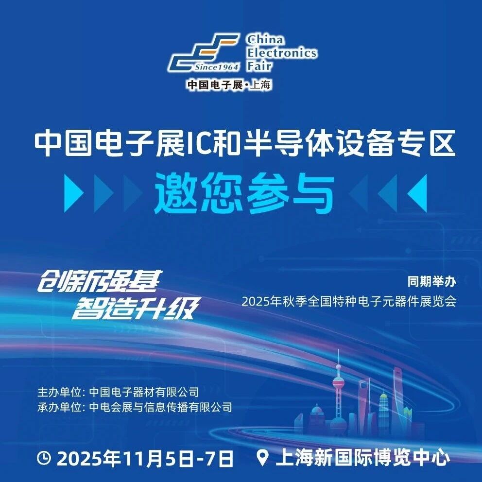 2.5万平方米展区 600多家参展企业 涵盖电子全产业链 搭建新技术、新产品、新成果"黄金秀场" 预计20000名专业观众到场 上海新国际博览中心(N5、N4) 2025年11月5-7日 第106届中国电子展即将开启 作为电子行业风向标,本届展会聚焦基础电子元器件、集成电路、半导体设备与核心零部件、电子 制造设备、特种电子等核心领域,全力构建协同创新的产业生态,打造推动中国电子信息产业高质 量发展的核心平台。 IC&半导体设备专区 本届中国电子展在N5馆特设集成电路主题展区和半导体设备与核心部件展区,汇聚了 华大半导 体、中国兵器工业第二一四研究所、满芯科技、木林胜、陕西半导体先导技术中心、芯景铄、全芯 智造、江苏中德电子、凯诺中星科技、奇异摩尔、杰理科技、芯来智融半导体、微纳核芯电子、博 泰车联网科技、京微齐力、盛美半导体、联盛半导体、苏州维嘉科技、江苏神州半导体、北京华丞 电子、山东力冠微电子、北京中电科电子、魏德米勒 等产业链硬核力量,全方位展示在先进设 计、特色工艺、先进封测、关键装备与部件等环节的体系化突破与协同创新成果,彰显国产替代的 系统能力与坚定步伐。 展会期间,展馆内还将同期举办多场高端论坛 ...