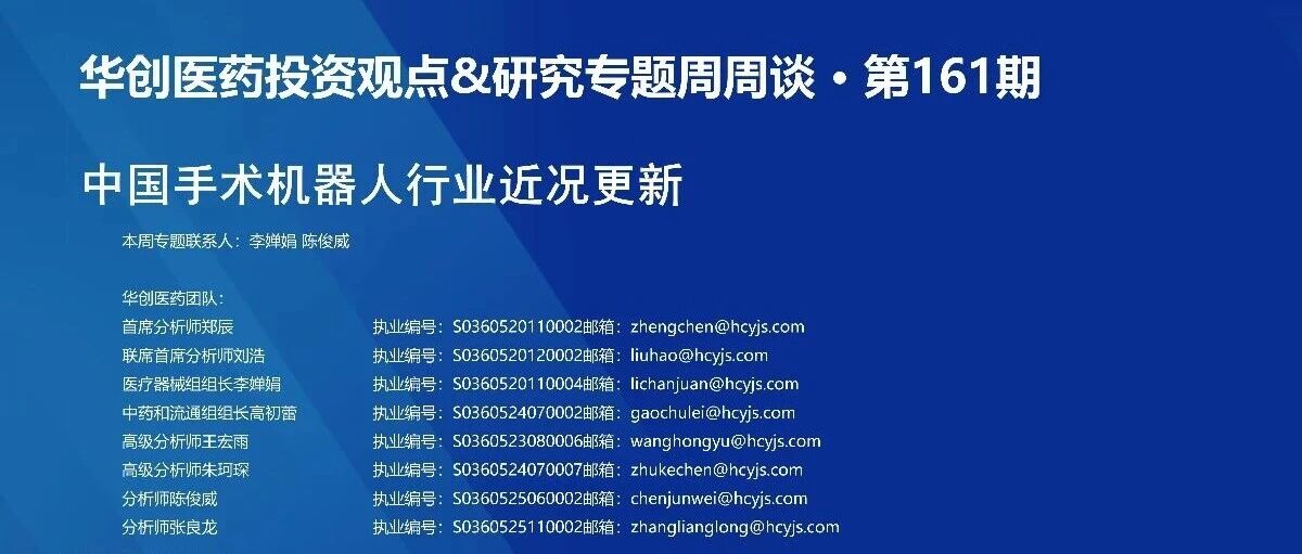 证券研究报告 | 医药生物 | 2026年01月31日 www.hczq.com 华创医药投资观点&研究专题周周谈 ·第161期 中国手术机器人行业近况更新 本周专题联系人:李焯娟 陈俊威 | 华创医药团队: | | | --- | --- | | 首席分析师郑辰 | 执业编号:S0360520110002邮箱:zhengchen@hcyjs.com | | 联席首席分析师刘浩 | 执业编号: S0360520120002邮箱: liuhao@hcyjs.com | | 医疗器械组组长李蝉娟 | 执业编号: S0360520110004邮箱: lichanjuan@hcyjs.com | | 中药和流通组组长高初营 | 执业编号:S0360524070002邮箱:gaochulei@hcyjs.com | | 高级分析师王宏雨 | 执业编号: S0360523080006邮箱: wanghongyu@hcyjs.com | | 高级分析师朱珂琛 | 执业编号: S0360524070007邮箱:zhukechen@hcyjs.com | | 分析师陈俊威 | 执业编号:S0360525060002邮箱:che ...