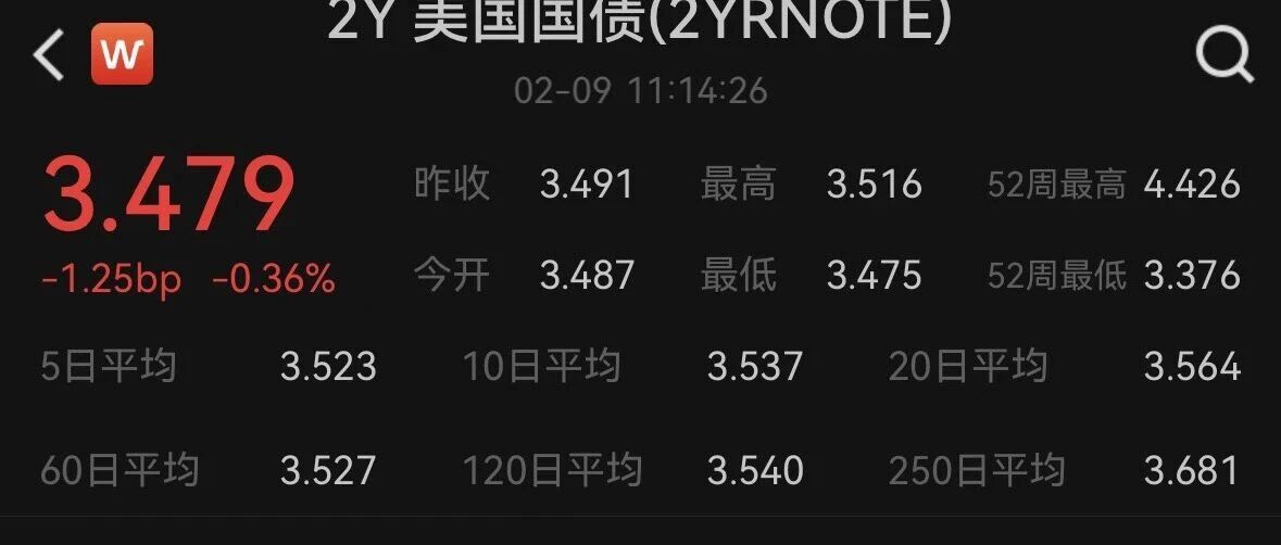 原来根子在这里。 2Y 美国国债(2YRNOTE) W 02-09 11:14:26 3.479 最高 3.516 52周最高 4.426 昨收 3.491 今开 3.487 最低 3.475 52周最低 3.376 -1.25bp -0.36% 3.523 10日平均 3.537 20日平均 3.564 5日平均 60日平均 3.527 120日平均 3.540 250日平均 3.681 日K 分时 F (0) 叠加 设均线 EXPMA15:3.533↓ 50:3.708↓ 120:3.836↓ 268:3.371↑ 0:0 445.268 3.914 3.3. 2.383 2025-07-04 2026-02-09 2023-10-06 24-04-12 美股也交易的短久期,谁涨价 涨谁! 半导体也涨的光纤 要贴现估值的长久期品类 ,最近也很惨。 我就说moltbot 等等 各种亮眼应用都没让 csp 大模型厂起来。 长期国债收益率根本没下来 ...