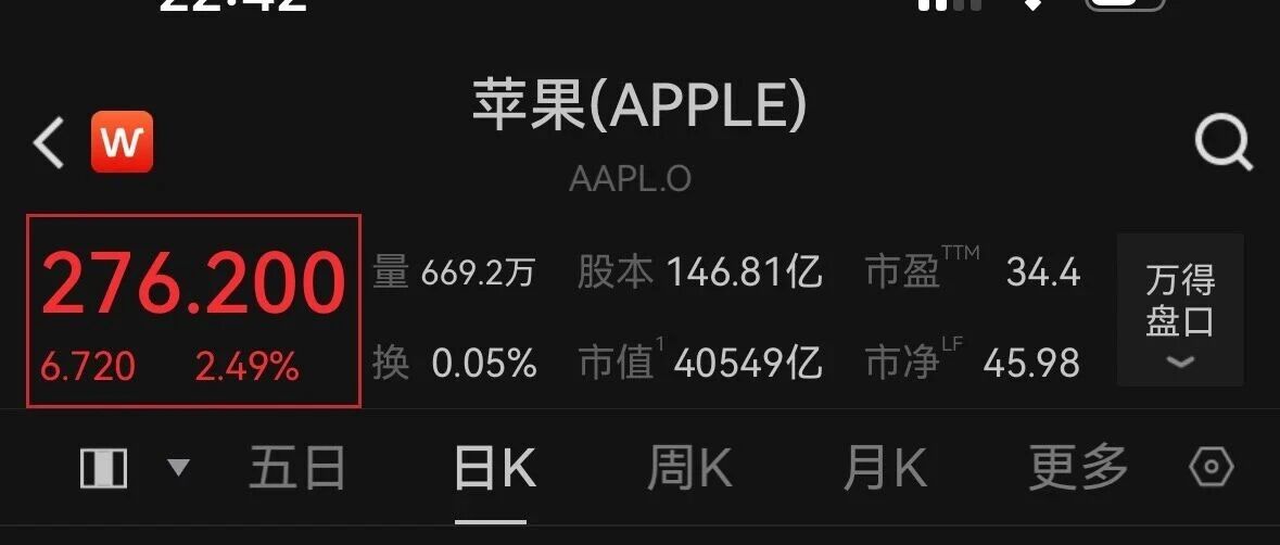老美也涨老登 消费电子特别惨,过去三个季度 卖pc的已经不想理咱们问询了 22:42 .။ ? ( 苹果(APPLE) √ W AAPL.O 276.200 量 669.2万 股本 146.81亿 市盈™ 34.4 万得 盘口 换 0.05% 市值 40549亿 市净 45.98 6.720 2.49% ■ ▼ 五日 日K 周K 月K 电子 (0) 叠加 设均线 BBI:263.69 前复权 292.834 <- 288.620 66.020 >> 243.420 239.206 and and the best of the best of the first 1 1 1 1 2026-01-16 12-11 12-11 12-30 02-04 2025-11-21 MACD(12,26,9) DIF:0.19121 DEA:-2.72469 MACD:5.83178 " " 6.24 TRIX(12.9) -0.13 TRMA:0.00 X -0.36 卖空股数 0.00 X 0 14 49523.42 添加提醒 加自选 电子 分享 道琼斯 22:40 .II ? I 美国银行(BANK OF AMERI ...