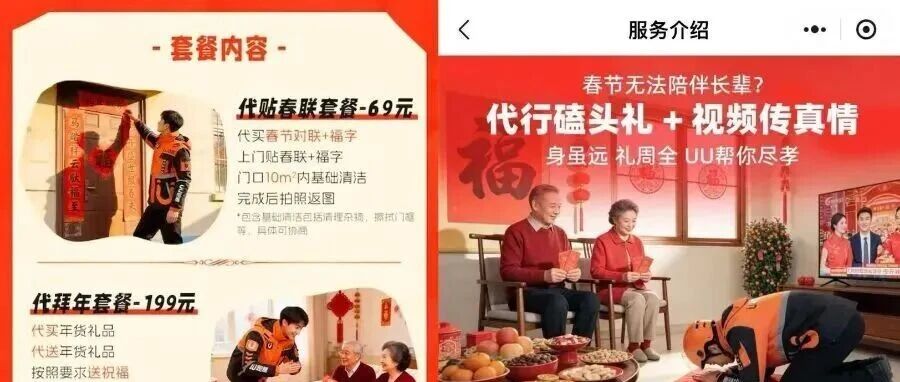 据悉,UU跑腿此前已推出过代祭扫等情感类服务。此次代拜年服务暂时仅在春节期间提 供,已在全国180个城市上线。目前,其小程序上的"代拜年"服务列表中,已无999元套餐 选项。据平台客服解释,该套餐因"页面调整优化"暂时下线,后续优化完成后可能重新上 线,具体以页面显示为准。 来源:界面新闻 2月9日,UU跑腿推出了春节代拜年服务。其中,999元的"代拜长辈套餐"因包含"行传统 礼仪""代磕头"等内容,引发讨论。 999元的服务除送年货外,还包括说吉祥话、行传统礼仪(含代磕头)及实时视频直播。平 台强调,代磕头仅针对长辈、老年人,服务全程基于双方自愿,不可恶搞、故意为难"跑 男","跑男"可无责取消订单。 对此,有支持者认为这为无法返乡的子女提供了情感联结的补充方式;反对者则批评这将传 统礼仪变为"形式主义的表演",担忧孝心被商品化。 更多财经视频,请关注视频号"新浪财经" 往期回顾 (3) 连 接 财 富 下 载 新 浪 财 经 客 户 端 ...