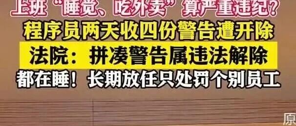 2、所谓的"擅离岗位",不过是培训期没活的时候去茶水间、接个电话,每次都不到 30 分钟,根本不算违规。 上海有个程序员,就因为上班时吃了个外卖、累了趴在桌上眯了会儿,居然被公司以"严重违纪"开除了! 在微博看到这个新闻时把小蒜都给整无语了,好在最后法院判公司违法,赔了 11 万多。 事情是这样的: 程序员小陈在上海一家外包公司干了 4 年,本来好好的,结果项目一撤,他就被公司发配到了一个宝山区办 公点。 说是培训,其实就是没活干,人事专门盯着监控抓小辫子 。 三个月后,公司突然发难:先是给了他一份书面警告,说他"5 次上班睡觉超过半小时",紧接着一天内又追加 了"擅离岗位"、"吃外卖"、"用个人电脑"三连口头警告,然后直接把这三个口头警告合并成第二份书面警告, 以"一个月内两次书面警告"为由,把他开除了。 二 小陈不服,先仲裁败诉,又起诉到法院。法院一查监控,直接戳穿了公司的把戏: 1、 监控是用来保安全的,不是用来秋后算账的! 小陈睡觉的同时,其他同事也在摸鱼小憩,公司之前不 管,现在却只罚他,典型的"选择性执法"。 3、公司倒查几个月的监控,把零散的小事硬凑成"严重违纪",甚至把同一天的口头警告合并成书 ...