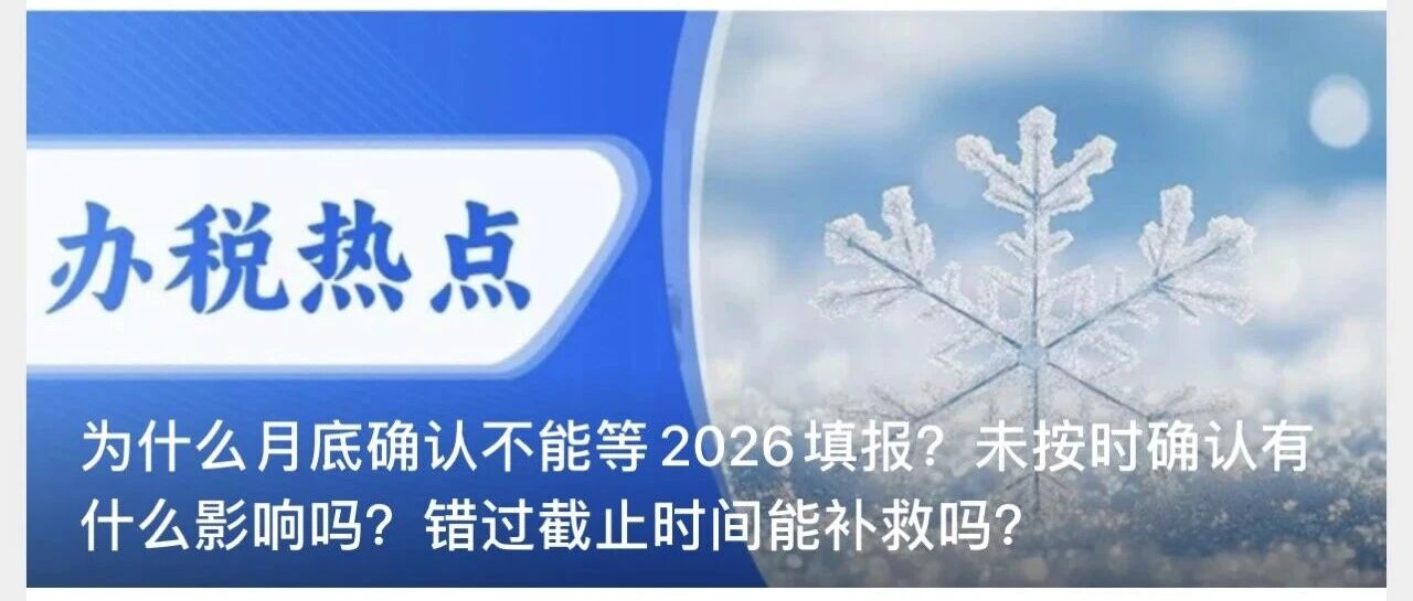 欢迎扫描下方二维码关注: —— 第四十六期 —— 每周高频热点问题汇编 2026年度个人所得税专项附加扣除信息确认已进入倒计时,截止时间为 2025年12月31日 ,税务部门提醒符合条件的居民个 人,务必及时通过个人所得税 APP完成操作!后台收到不少小伙伴的疑问: 为什么必须月底确认? 2026年填报行不行?申报前确 认不行吗?未按时确认有啥影响?错过时间能补救吗? 今天就结合这些问题,跟大家说清为啥要在年底前完成确认~ 一、 为什么 不能等2026确认? 根据 《个人所得税专项附加扣除操作办法(试行)》第九条 的规定,纳税人次年需要由扣缴义务人继续办理专项附加扣除 的,应当于每年12月份对次年享受专项附加扣除的内容进行确认,并报送至扣缴义务人。纳税人未及时确认的,扣缴义务人于 次 年1月起暂停扣除 ,待纳税人确认后再行办理专项附加扣除。 小提示 1.提前确认才能"当月享受",2026年填报会延迟优惠。12月确认后,2026年1月发工资时,公司就能直接按扣除标准算税,到 手工资即时增多;次年填报的话,1月起会按"无扣除"预缴个税,多缴的部分要等2027年汇算清缴才能退税。 2.系统不会自动延续旧信息 , 哪 ...