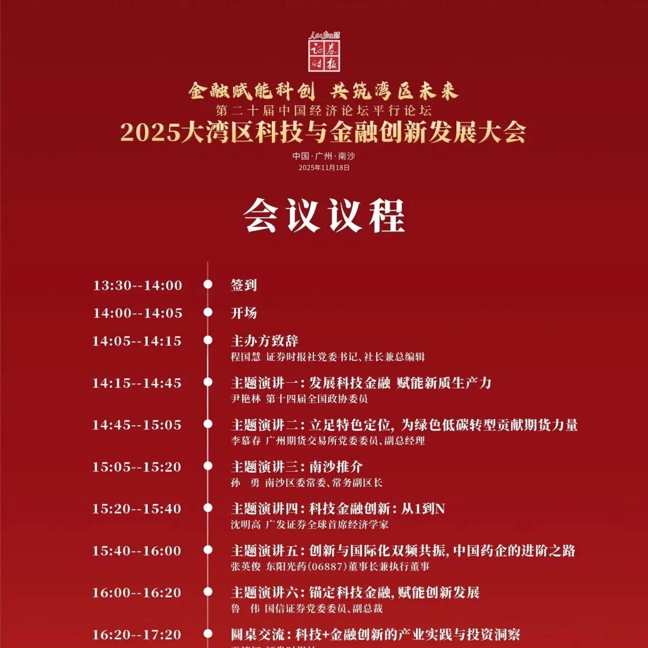 明日启幕。 第十五届全国运动会正在粤港澳大湾区如火如荼地进行,当观众把目光投向全运会史上首个跨境马拉松、首个跨境公路自行车等精彩赛事的同时,大湾区的另一场 重磅活动——第二十届中国经济论坛 也将于11月18日正式拉开帷幕 。作为本届论坛的重要组成部分,由证券时报社主办的平行论坛——"2025大湾区科技与金融创 新发展大会",备受期待。 当前,全球科技竞争格局深度调整,产业链加速重构,科技创新已成为大国博弈的核心战场。近年来,国家层面发布的有关政策多次明确提出,要构建同科技创新 相适应的科技金融体制,加强对国家重大科技任务和科技型中小企业的金融支持,完善长期资本 "投早、投小、投长期、投硬科技" 的支持政策。作为金融 "五篇大 文章" 之首,科技金融的发展既呼应我国现代化产业体系建设导向,也为新质生产力培育注入关键动能。 总结"十四五" 期间,金融创新赋能科技发展的丰硕成果;展望"十五五",科技与金融创新的融合发展将如何进一步走深走实?本次大会,将以 "金融赋能科创 共筑 湾区未来" 为核心主题,聚焦科技与金融的共生共荣、双向奔赴。 活动将汇聚券商、基金、银行、期货、上市公司、科技企业等领域的从业人士、专家学者 ...