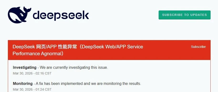 "DeepSeek崩了"登上热搜。DeepSeek官方服务状态网站显示,DeepSeek网页、APP服务出现重大中断。 准确 快速 权威 专业 根据事件报告,昨日21:35,DeepSeek发现网页、APP服务异常,并进行调查,于当日23:23解决该事件。 7x24h电报 头条新闻 VIP资讯 实时盯盘 今日00:20,DeepSeek对网页、APP性能异常问题进行调查,并于01:24实施修复方案,但截至发稿,该事件仍未被解决。 下载财联社APP获取更多资讯 | DeepSeek 网页/APP 性能异常(DeepSeek Web/APP Service | Subscribe | | --- | --- | | Performance Agnormal) | | | Investigating - We are currently investigating this issue. | | | Mar 30, 2026 - 02:16 CST | | | Monitoring - A fix has been implemented and we are monitoring the results. | | ...