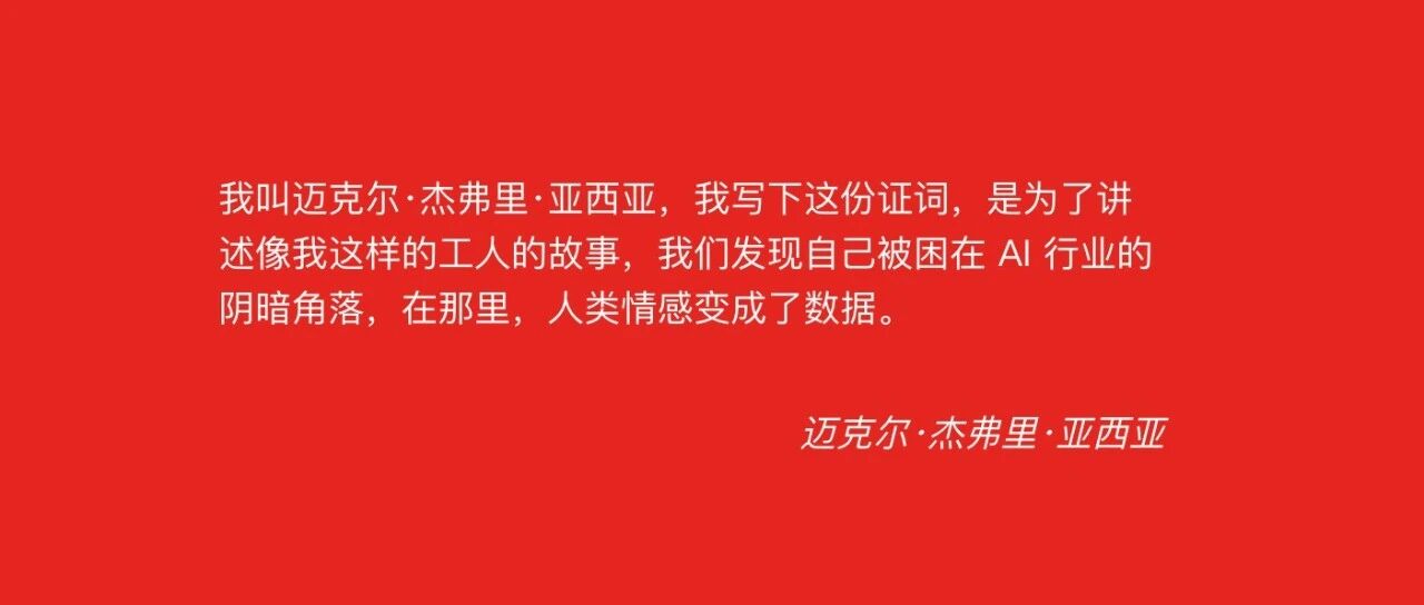 最近看到一个故事。 让我突然有一个想开系列坑的想法,这个系列,就叫。 《AI时代浪潮下的新职业》。 就比如,和你聊天的AI萌妹背后,可能是一个把键盘敲出火星子的胡茬大哥。 还有在发达国家的工厂机器人背后,可能并没有什么所谓的具身智能,都是一个活生生的菲律宾遥操手。 还有那AI漫剧工厂里,一个个正在批量生图生视频的新时代流水线。 而今天想说的这个故事,就跟第一个AI萌妹聊天有关。 也是我最近在一个网站上发现的,真实事件。 就是,一个叫迈克尔的肯尼亚小伙在这个网站上自爆了狼人身份。 他说,你们看到的AI陪伴背后,根本就不是AI,是真人。 而他,就是那个藏在AI背后给你kuku敲键盘的人。 还写了8页的PDF,来控诉这件事。 而他的故事,是我在一个叫Data Worker's Inquiry的网站里发现的。 这个网站,就是一个持续的研究项目,主要关注全世界的数据工作者都在干啥。 说明一下,这里的数据工作者更多指的是数据标注、审核这种初级工作者,跟数据工程师这种代码工作者不沾边。 相关的资料,他们会总结出来放在网站里,页面长这样,语言风格很有精神。 说实话,他也是挺冤的,因为他应聘的时候根本不知道自己是要扮演AI跟别 ...
