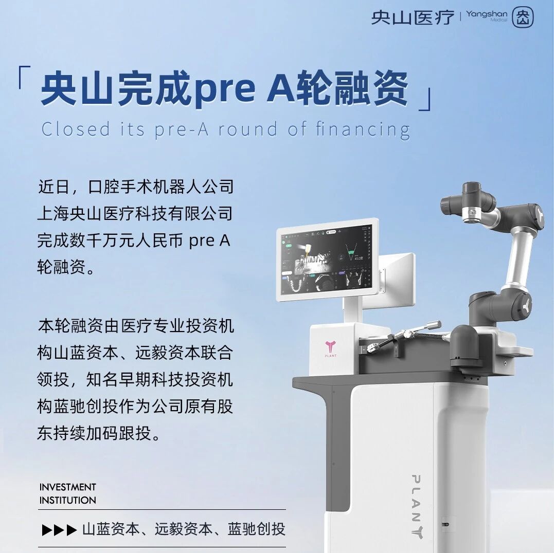 通知 | 关于举办"2026大湾区工业具身智能大会"的通知 近日, 口腔手术机器人公司 上海央山医疗科技有限公司(以下简称:央山医疗) 完成数千万元人民币 pre A轮融资。本轮融资由医疗专业投资机构 山蓝资本、远毅资本 联合领投,知名早期科技投资机构 蓝 驰创投 作为公司原有股东持续加码跟投。 领投,知名早期科技投资机 构蓝驰创投作为公司原有股 东持续加码跟投。 F INVESTMENT L A N T INSTITUTION ▶▶▶ 山蓝资本、远毅资本、蓝驰创投 DID牙种植牵引器 国家局创新医疗器械特别审查程序 管理局医疗器械技术审评中心 山蓝资本 YANGSHAN MEDICAL RAISES PRE-A ROUND 投资总监杭元恺表示: 医疗手术机器人赛道正迎来技术落地与需求 释放的双重红利。央山医疗在核心导航技术 研发与产品口腔场景适配方面构建了鲜明壁 垒、其产品在口腔种植手术中展现出的高效 性与稳定性令人印象深刻。我们看好公司团 队扎实的技术沉淀与清晰的商业化路径,期 待通过本次投资、助力公司加速市场渗透、 推动口腔行业数智化升级。 近教资本 董事总经理唐轶男訓为: 机器人技术正在推动口腔种植进 ...