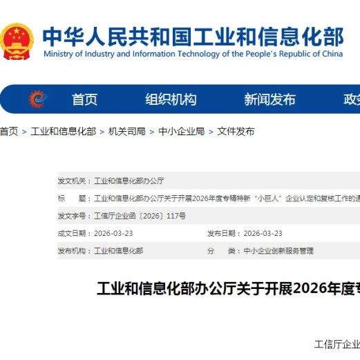 | 1.4.2 | 中华人民共和国工业和信息化部 | | | | ■ 阳光小信 无障碍 手机端 邮箱 微信 微博 RSS订阅 | | --- | --- | --- | --- | --- | --- | | 36 | Ministry of Industry and Information Technology of the People's Republic of China | | 请输入关键字 | | Q | | ್ತಿ | 首页 新闻发布 | 组织机构 | 政务服务 | 政务公开 | 互动交流 工信数据 | | | | 首页 > 工业和信息化部 > 机关司局 > 中小企业局 > 文件发布 | | | | | 发文机关:工业和信息化部办公厅 | | | --- | --- | | 标 题:工业和信息化部办公厅关于开展2026年度专精特新 "小巨人"企业认定和复核工作的通知 | | | 发文字号: 工信厅企业函〔2026〕117号 | | | 成文日期:2026-03-23 | 发布日期:2026-03-23 | | 发布机构:工业和信息化部 | ਜੋ 製;中小企业创新服务管理 | 各省、自治区、直辖市 ...