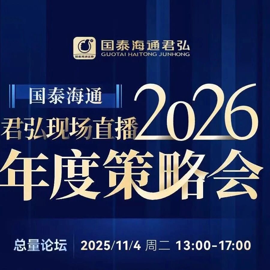 海 博君弘 2026年度宏观展望 演讲嘉宾 梁中华|云观研究首席分析师 14:00-14:30 2026年度投资权益策略展望 国泰海通 型 现场直播 年度策略 总量论坛 2025/11/4 周二 13:00-17:00 看现场 · 直击市场策略发布 解观点 ·精选投资理财方案 主题速览 13:00-13:30 金牌投顾带你逛策略会 主持人 陈昕怡丨君弘APP主持人 对话嘉宾 潘生荣| 金牌投顾 晉 丹|金牌投顾 13:30-14:00 演讲嘉宾 方 奕|策略研究首席分析师 14:30-15:00 2026年度潜股投资策略展望 天信坪 | 冯外束哈目席分析师 澳洲翡兵 15:00-15:30 2026年度金融工程策略展望 演讲嘉宾 郑雅斌|金融工程研究首席分析师 15:30-16:00 2026年度基金评价展望 演讲嘉宾 倪韵婷|基金评价与研究首席分析师 16:30-17:00 2026年债市展望 演讲嘉宾 唐元懋|固定收益研究领域负责人 直播间专属福利"投资秘籍" 提前预约开播领取 《年度投资策略报告精要》、《重点板块观点集锦》 《ETF投资策略精要》等 2026年度IPO市场展望 演讲嘉宾 王政之 | 新股 ...