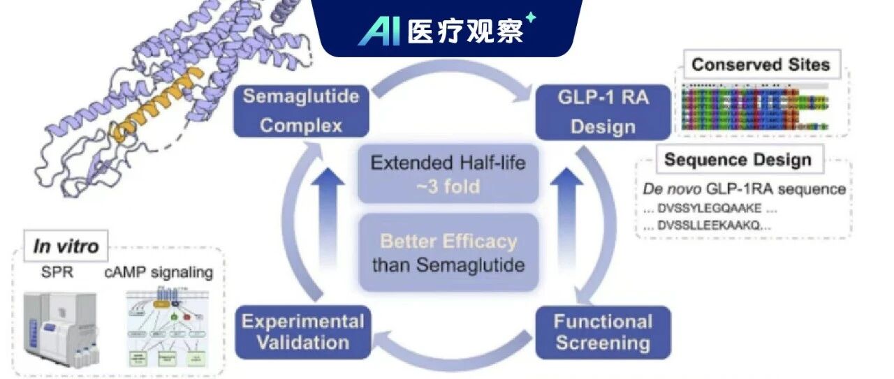 以下文章来源于AI医疗观察 ,作者关注AI医疗的 AI医疗观察 . 响应《关于深入实施"人工智能+"行动的意见》,推动AI在医疗领域的应用,本账号发布权威资讯 一项刊登在《Advanced Science》上的最新研究,展现了人工智能在药物开发中的颠覆性进展。上海交通大学的科研团队运用深度学习创新方 法,成功设计出超长效GLP-1受体激动剂(GLP-1 RAs),其半衰期是现有明星药物司美格鲁肽的三倍。 令人瞩目的是,从分子设计到候选药物筛选,整个过程仅耗时两周,便锁定了具有临床潜力的新药,彻底打破了以往药物研发动辄数年才能完 成的传统模式。 肽类药物:机遇与挑战并存 肽类药物已成为现代医学治疗体系中不可或缺的一环,为多类疾病带来了全新的治疗方案。2024年,全球肽类药物市场规模已达到491.3亿美 元,预计到2034年有望增至837.5亿美元。 尽管市场前景广阔,肽药物依然面临代谢稳定性不足、血浆半衰期短和易被蛋白酶降解等难题,这些因素极大限制了其在临床上的推广和应 用。 传统肽药物的设计过程主要依赖于耗时且高成本的反复试验,需要经历多轮"设计—合成—测试—分析"的循环,从初步发现到获得临床前候选 药物往往 ...