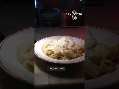 Here at the Winter Olympics in Italy, around 1,300 pounds of pasta are served every day to athletes, and they seem to love it. But pasta is not only a delicious Italian dish, it's also considered a carbohydrate-rich staple to fuel performance. As this restaurant here in Milan puts it, fresh pasta, cool rides, carbs before curves, and my favorite, eat pasta, ski pasta.But there is a classic Italian pasta that some say was invented by Americans. Carbonara. >> For years now, some Italian food historians have c ...