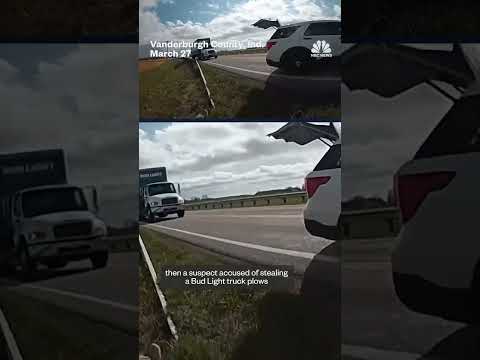 The wild ending to a chase in Indiana. Body cam video shows a deputy parking his patrol SUV in the road and throwing out rumble strips. Then a suspect accused of stealing a flood light truck plows right into the patrol car and veers into a field.Deputies surround him and force him out of the. ...