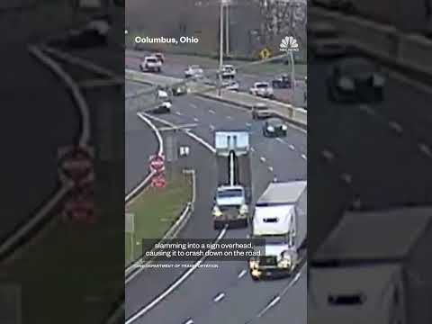 A scary moment on a major highway in Ohio. You can see a dump truck, look at this, driving with its bed flipped up before slamming into a sign overhead, causing it to crash down on the road. A car swerving to get around the debris.Officials with the Ohio Department of Transportation say the incident shut down the highway for about five. ...