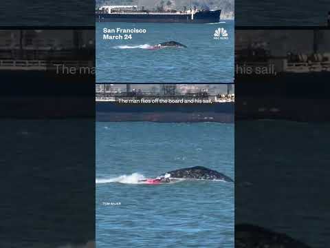 Check out this wild collision at a California wind surfer speeding through the San Francisco Bay before hitting a whale that surfaces in his path. The man flies off the board and sail and his sail you see collapses into the water while the whale disappears into the bay. ...
