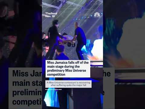 Miss Jamaica falls off of the main stage during the preliminary Miss Universe competition