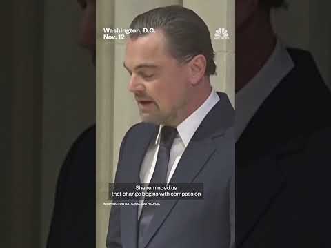 Leonardo DiCaprio speaks at Jane Goodall's funeral