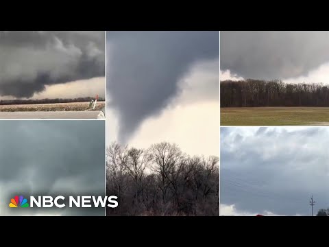 Tonight, new images of intense tornado damage marring Illinois and Indiana after a monster supercell system brought at least seven reported twisters overnight. This massive funnel cloud hovering over drivers in Illinois. And in this video, another one forms in real time.>> Massive rotation. Massive rotation. Look at that.>> Sirens echoing for miles. You also see lightning and pounding hail in Bloomington, Indiana. The storm ripping apart several homes and businesses, including this car dealership.>> Multipl ...