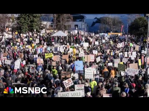 And we begin tonight with the massive No Kings protests that took place all over the country and the world this weekend. Organizers say that nearly 7 million marchers turned out in big cities and small towns to protest Donald Trump and his policies. And notably, the protests were peaceful. The NYPD said over a 100,000 people gathered in New York City alone without a single arrest. In San Francisco, Americans used their own bodies to spell out the message of the day. No kings. And while Trump did his best to ...