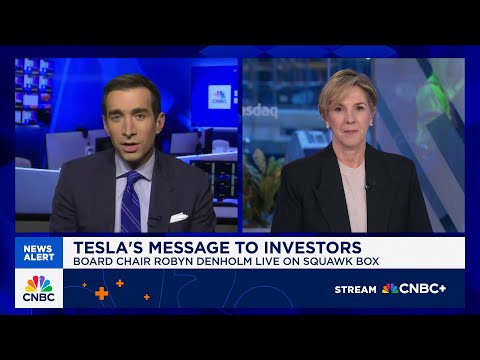 We've got a big interview for you. Tesla's annual shareholder meeting is next week where investors in the company will vote on a new pay package for CEO Elon Musk could grant him nearly a trillion dollars more in stock. And joining us first right now on CNBC is Tesla's board chair, Robin Denhal.And we're thrilled to have her and the entire uh Tesla operation outside there with the Optimus robot, the robo taxis, and everything else. Robin, it's good to see you. Thanks for joining us.>> Great to see you as we ...