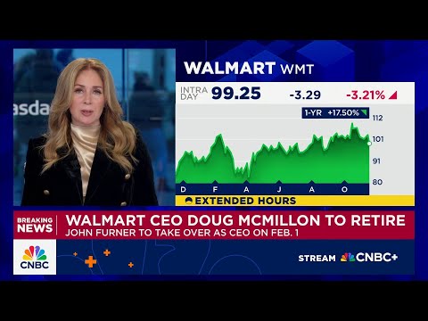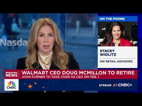 All right, some breaking news earlier this hour. It is pretty shocking. Uh Walmart CEO Doug McMillan announcing that he will retire.John Ferner is going to be taking over as CEO on February 1st. Joining us right now is Stacy Whit. She is with SS SSW Retail Advisors.And Stacy, the market sold off on this news. Right now, Walmart shares off by 2 and 3/4%. Uh Doug's been a stalwart.he has really led that company to impressive levels not only in the market cap but also with what he's done in terms of diversifyi ...