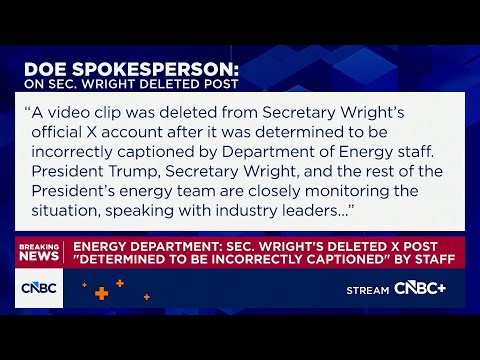 We have some breaking news out of the Department of Energy. Pippa Stevens has got that. Pippa.>> Hey Melissa, finally getting some clarity here on that since deleted post from Secretary Wright with a DOE spokesperson saying that the post was deleted after it was determined to be incorrectly captioned by Department of Energy staff. The spokesperson added that President Trump, Secretary Wright, and the rest of the president's energy team are closely monitoring the situation, speaking with industry leaders, an ...