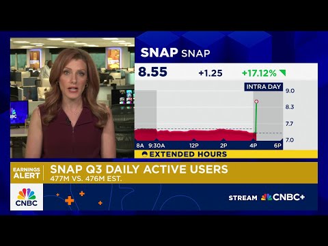 Hey, Snapshare is soaring. Uh, the stock now is up about 15% in after hours trading as the company revenue beat expectations 1.51% billion versus the 1.49% billion estimated with 1 million more daily active users than anticipated. The company's earnings per share loss of 6 cents isn't comparable to expectations, but adjusted IBIDA of 182 million did top estimates of 125 million.Snap announcing a $500 million stock repurchase program and also guiding to fourth quarter revenue in a range with a midpoint just ...