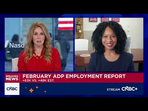 ADP private payroll data is out showing a jump in February. Private employment was up 63,000. That beat the street estimate of 48,000 for the best month for job gains since July of last year.Education and health services along with construction led the growth. The biggest lagards were professional and business services and manufacturing. Joining us right now is ADP's chief economist Nila Richardson.Nila, thanks for being with us. The numbers were better than the street was expecting. Did it surprise you, to ...