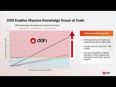 AI Inference Challenges & KV Caching Solution - AI inference faces challenges with large context windows, impacting tokenization and latency [1][2] - Caching context tokens speeds up responsiveness, lowers latency, and allows storing larger context amounts [4] - Effective caching requires storage systems with low latency and large capacity at scale [5] DDN's Solution & Performance - DDN's Exoscaler platform enables high-performance KV caching for AI inference, improving user concurrency, responsiveness, and user experience [7] - DDN leverages GPU direct storage (GDS) for cached engine [9] - Caching demonstrates a 10x improvement in performance with larger context [14] - DDN's Exoscaler performance can improve time to first token during inference by 10-25x [16] - DDN improves response times, provides larger cache repository space, and delivers cost-effective performance and capacity density [17] Capacity Implications - KV caching accelerates the end-user experience, putting a premium on high-performance shared storage [16] - Approximately 200,000 input characters resulted in a cache of 796 files, totaling almost 13 gigabytes [15]