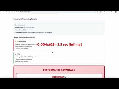 Performance Comparison - DDN Infinia writes chunks at 0041 seconds (4 milliseconds) per chunk, significantly faster than AWS [6] - AWS object store writes each chunk at 01169 seconds (112 milliseconds) per chunk [7] - DDN Infinia uploads a 628-chunk document in approximately 25 seconds, while AWS takes around 74 seconds [7] - DDN Infinia is approximately 285 times faster than AWS in document upload [7] - DDN Infinia retrieves chunks in 01600 seconds (160 milliseconds) total, averaging 32 milliseconds per chunk [13] - AWS retrieves chunks in 165 seconds, with each chunk taking 331 milliseconds [14] - DDN Infinia is 103 times faster than AWS in total query retrieval time [14] AI Pipeline Impact - With DDN Infinia, an analyst can upload and query an annual report in just 2 seconds [8] - A 30x performance advantage transforms the entire AI pipeline, making documents readily available for AI consumption [9] - Reduced latency with DDN Infinia can save significant time, potentially turning a 5-minute research task into 3 seconds [15] - Latency compounds across multiple users and sessions, impacting GPU economics and overall productivity [15]