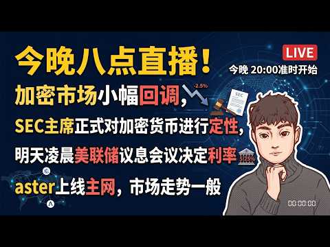 今晚八点直播!加密市场小幅回调,SEC主席正式对加密货币进行定性,明天凌晨美联储议息会议决定利率,aster上线主网,市场走势一般【Vic TALK第1599期】