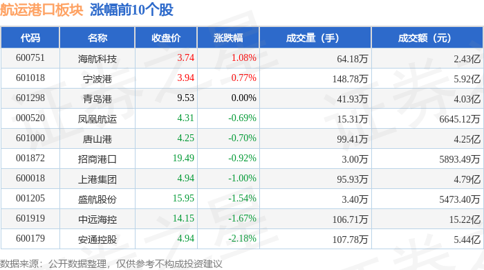 | 代码 | 名称 | 收盘价 | 涨跌幅 | 成交量(手) | 成交额(元) | | --- | --- | --- | --- | --- | --- | | 600751 | 海航科技 | 3.74 | 1.08% | 64.18万 | 2.43 Z | | 601018 | 宁波港 | 3.94 | 0.77% | 148.78万 | 5.92亿 | | 601298 | 黄明世 | 9.53 | 0.00% | 41.93万 | 4.03亿 | | 000520 | 凤凰航运 | 4.31 | -0.69% | - 15.31万 | 6645.12万 | | 601000 | 唐山港 | 4.25 | -0.70% | 99.41万 | 4.25 Z | | 001872 | 招商港口 | 19.49 | -0.92% | 3.00万 | 5893.49万 | | 600018 | 上港集团 | 4.94 | -1.00% | 95.93万 | 4.79亿 | | 001205 | 盛航股份 | 15.95 | -1.54% | 3.40万 | 5473.40万 | | 6161699 | 中远海控 ...