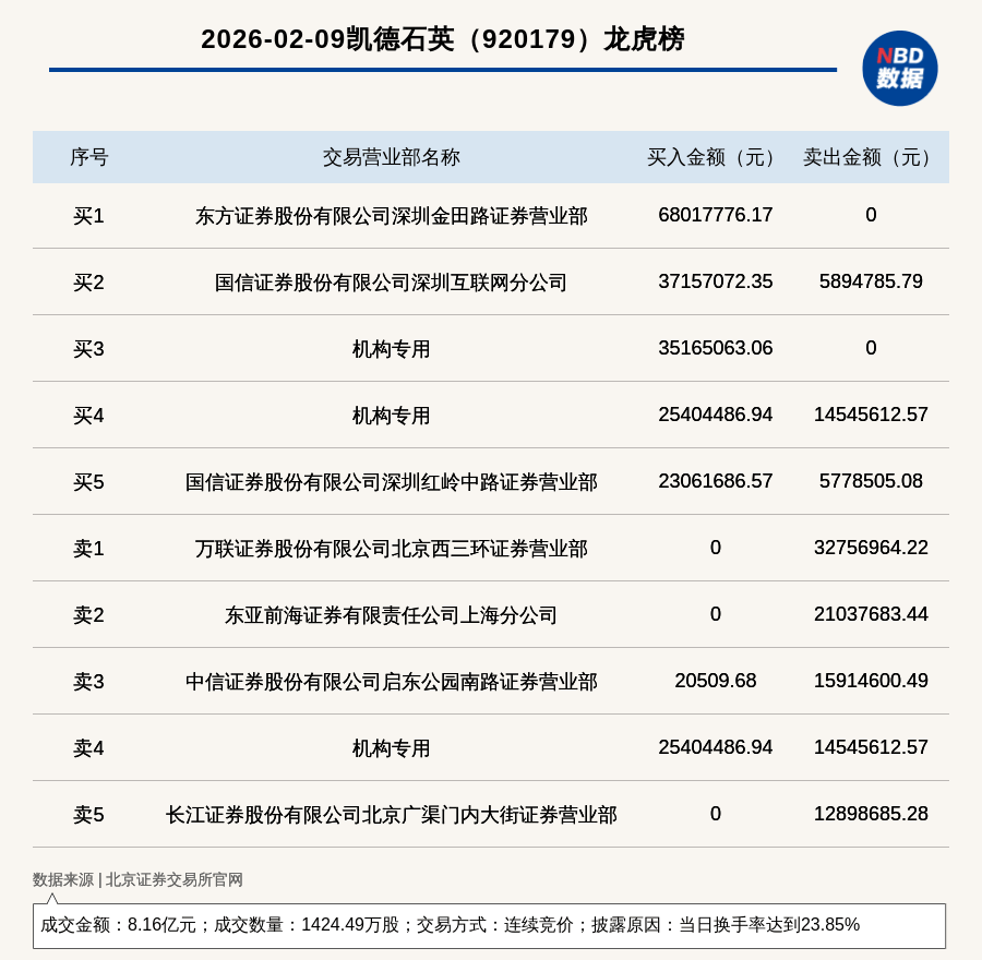 每经讯,2026年2月9日,北交所上市公司凯德石英(920179,收盘价:59.6元)登上龙虎榜,交易方式是连续竞价,披露原因是 当日换手率达到23.85%,成交数量1424.49万股,成交金额8.16亿元。买一席位为东方证券股份有限公司深圳金田路证券营业 部,买入6801.78万元;卖一席位为万联证券股份有限公司北京西三环证券营业部,卖出3275.7万元。 | | 2026-02-09凯德石英 (920179) 龙虎榜 | | | | --- | --- | --- | --- | | 序号 | 交易营业部名称 | 买入金额(元) | 卖出金额(元) | | ਜੇਟ ਹ | 东方证券股份有限公司深圳金田路证券营业部 | 68017776.17 | 0 | | 买2 | 国信证券股份有限公司深圳互联网分公司 | 37157072.35 | 5894785.79 | | 买3 | 机构专用 | 35165063.06 | 0 | | मेरिय | 机构专用 | 25404486.94 | 14545612.57 | | ન્નેર | 国信证券股份有限公司深圳红岭中路证券营业部 | 23061686.57 | ...