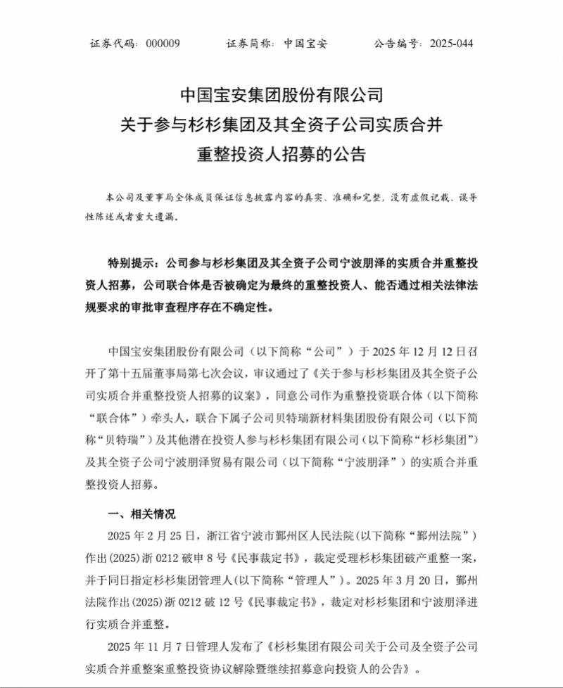 备受关注的杉杉集团破产重整案又现新剧情。 12月12日晚间,中国宝安公告称,董事会审议通过了《关于参与杉杉集团及其全资子公司实质合并重整 投资人招募的议案》,同意公司作为重整投资联合体(下称"联合体")牵头人,联合下属子公司贝特瑞 新材料集团股份有限公司(以下简称"贝特瑞")及其他潜在投资人参与杉杉集团及其全资子公司宁波朋 泽贸易有限公司(下称"宁波朋泽")的实质合并重整投资人招募。 目前,中国宝安按照杉杉集团管理人发布的公告要求,已提交了报名材料,缴纳了尽职调查保证金5000 万元,并委托了中介机构开展尽职调查。公司董事局授权公司管理层拟定和提交重整投资方案,参与现 场述标以及可能的竞争性谈判的工作。 2025年前三季度,中国宝安实现营业收入168.12亿元,同比上升14.87%;归属于上市公司股东的净利润 为2.83亿元,同比下滑26.51%。同期,贝特瑞实现营收123.84亿元,同比上升20.60%;归母净利润为 7.68亿元,同比上升14.37%。 负极材料双龙头整合或触发反垄断 据每日经济新闻报道,此次拟参与重整的贝特瑞与杉杉集团旗下杉杉股份是全球负极材料出货量前两位 的企业。 中国宝安在公告中提示 ...